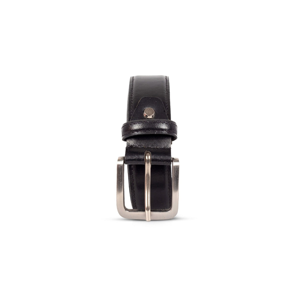 Premium black leather belt, versatile for formal or casual wear, with an adjustable pin buckle closure. Timeless style in genuine leather.