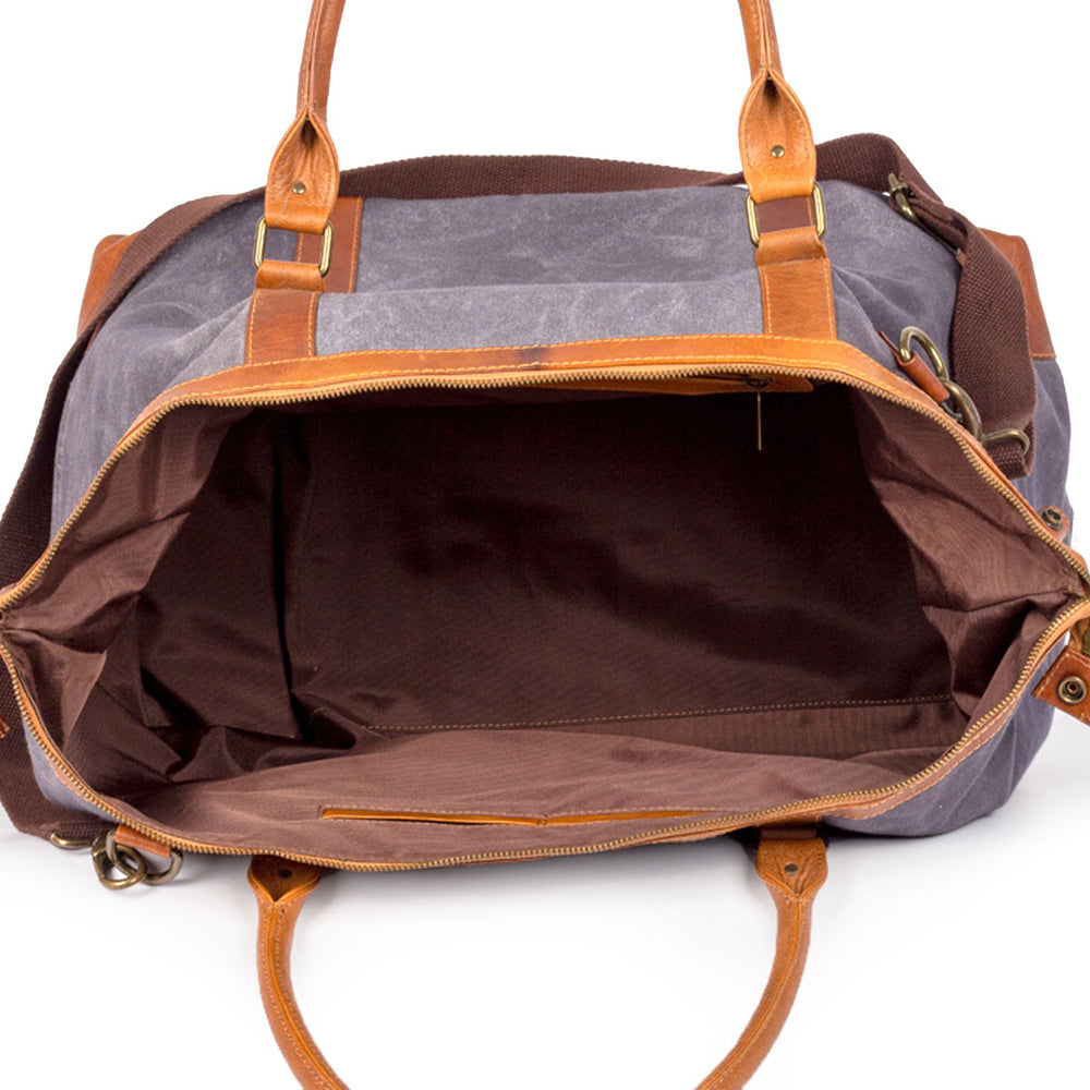 High-quality leather duffel, 49x36x20 dimensions, stylish design, spacious with laptop compartment, comfortable to wear, detachable strap for easy carrying.